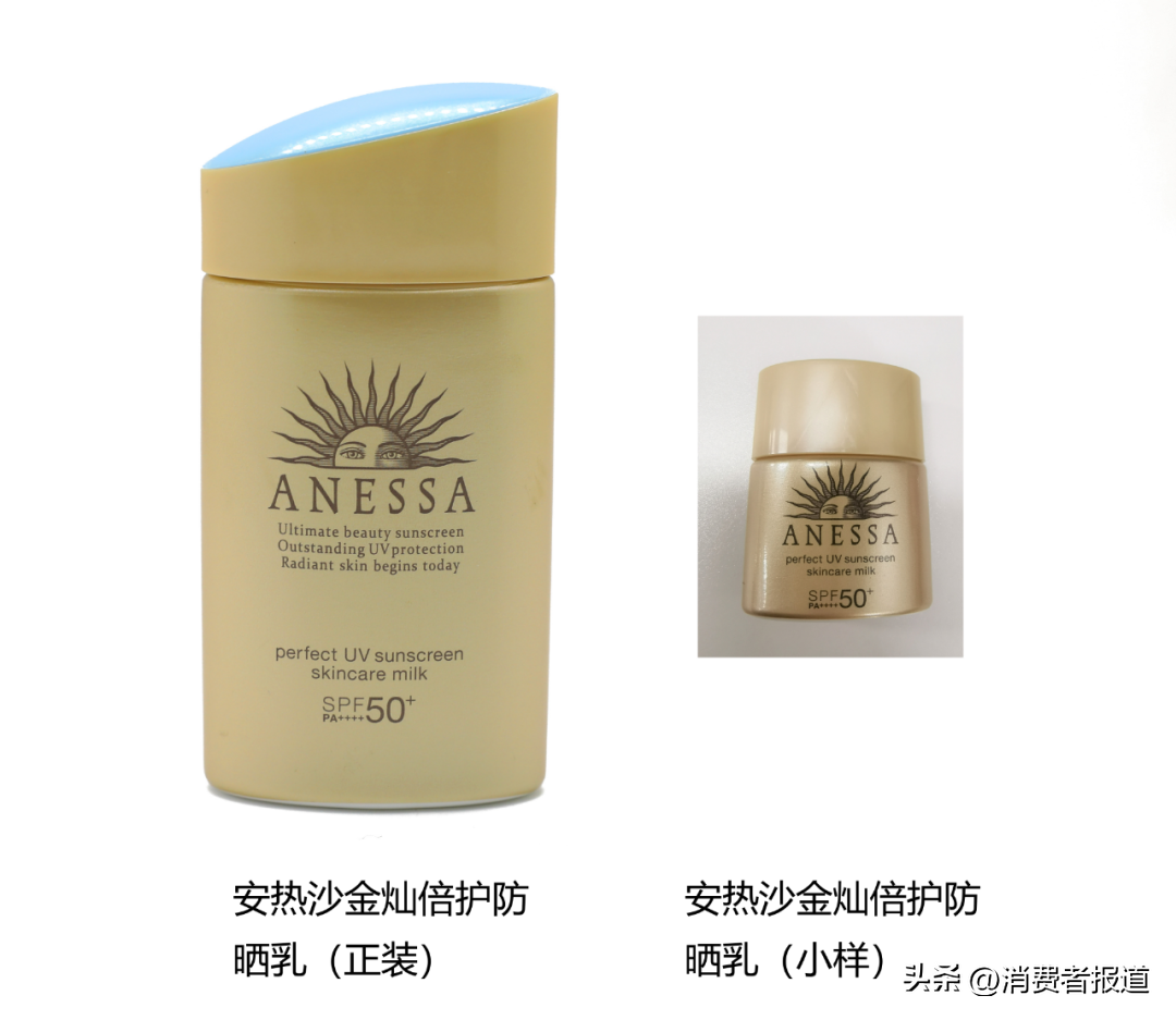 检测结果显示,大部分防晒霜与其小样或不同批次正装中的防晒剂含量几无差别,而安热沙ANESSA金灿倍护防晒乳正装与小样中(正装批次:1215DD-S;小样批次:1224KD-C),防晒剂二氧化钛含量分别为0.267%、0.99%,相差0.723%,小样的含量为正装的3.7倍,由于本身二氧化钛添加量基数小,因此0.723%是一个比较大的差距。