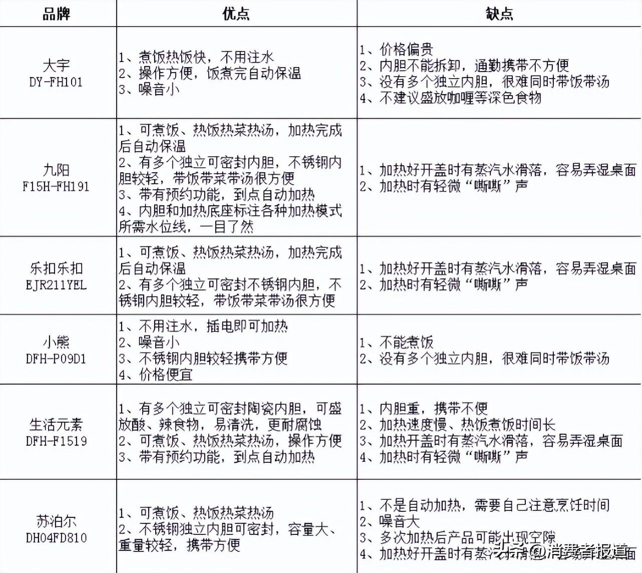 其他选购参考2020年4月,《消费者报道》汇总了京东、天猫、苏宁上热销的12款电热饭盒的评价情况,对约2万条消费者评价数据进行了分析和评分。详情请看《12款电热饭盒口碑对比:适盒性价比低,热饭温度仅70℃;生活元素、小熊口碑较好》