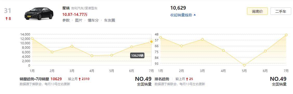 吉利星瑞刚上市那会就号称要“一个打十个”、做“家轿颠覆者”,如今通过销量数据来看,7月份星瑞一共卖出10629辆新车,倒也算是符合其初的那一定位。毫不夸张地说,星瑞的产品力在我看来是完全可以匹敌像别克君威、斯柯达速派之流车型的,毕竟,它可是全系都搭载的2.0T发动机。