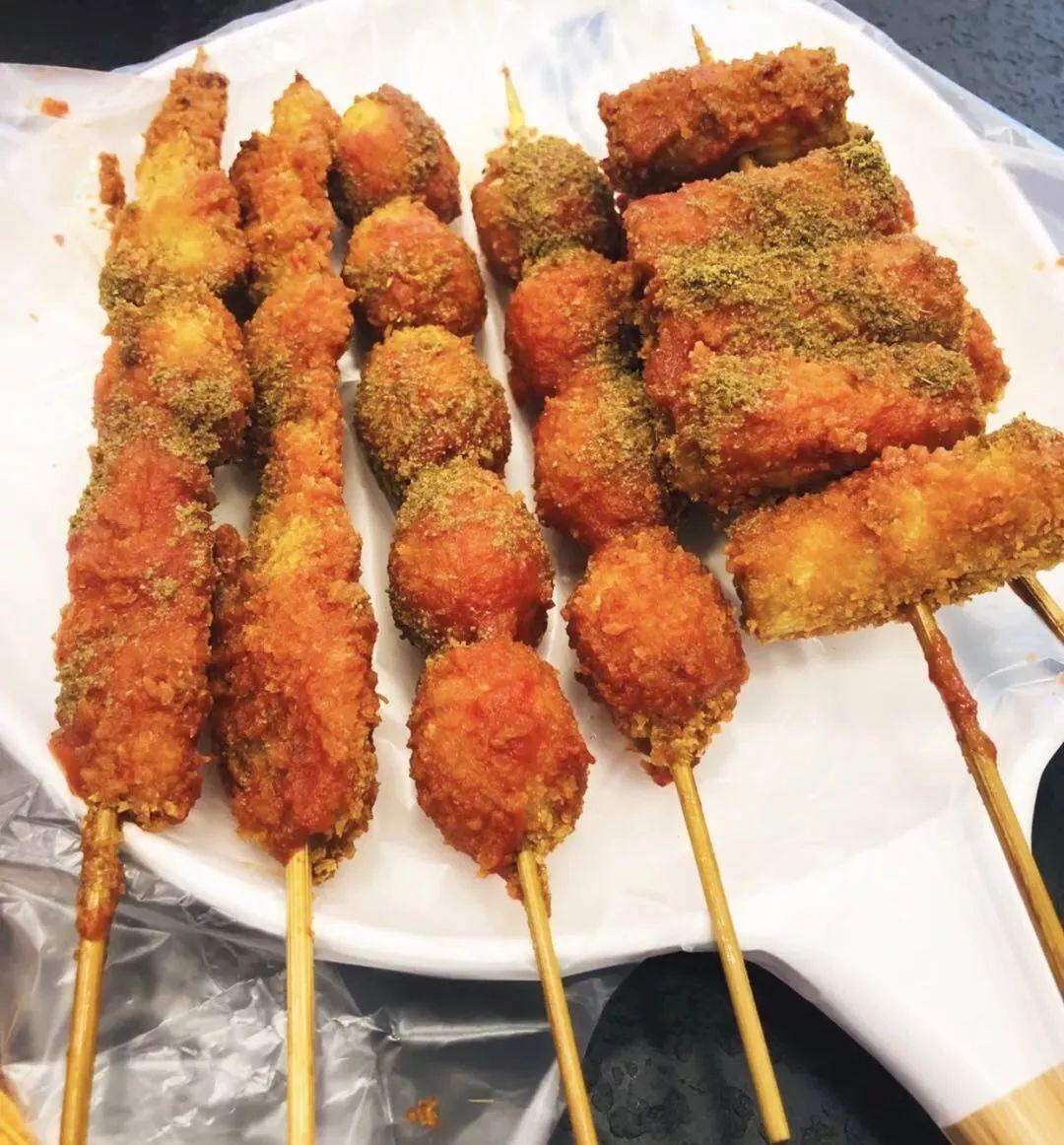 的非遗美食,也入驻老门口儿夜市啦,素串是穆记的精髓,每次必点,还有厚厚的牛排,炸的金黄酥脆,鹌鹑蛋裹上蛋液入口爽滑,番茄酱、孜然、辣椒面都不能少!