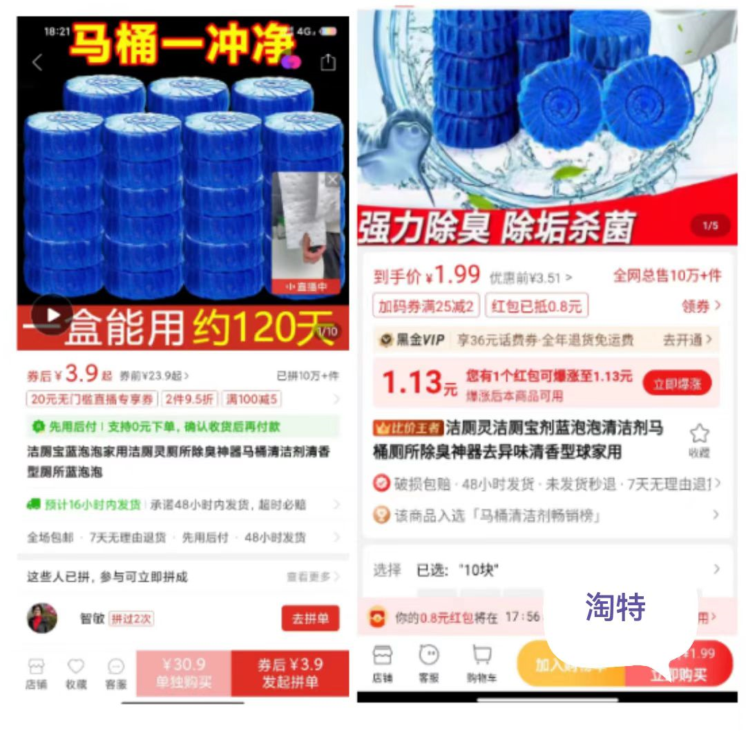 看到我不信,老婆直接在淘特上选了一款洁厕宝,我看到只需要1.13元。转身老婆又上了PDD找到同款洁厕宝,我一看3.9元,比淘特上的贵了2.77元,两倍还多。老婆又找了五六件商品,在两个平台上对比了一下,这真是没有比较真看不出来,这一比较还真是淘特便宜。