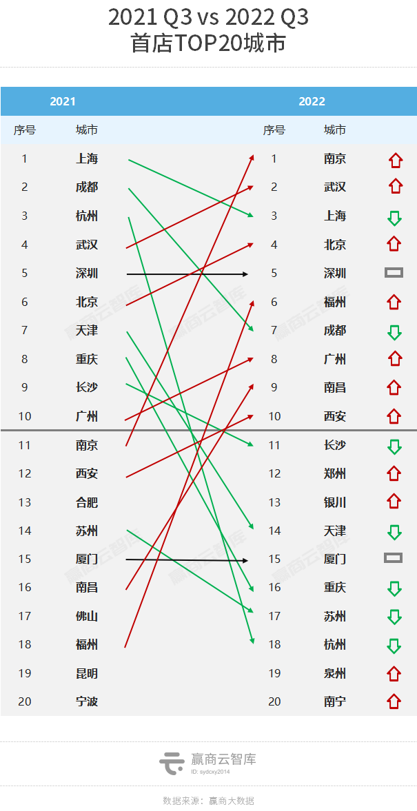 打开三季度944家首店热力图,横向对比2021年同期数据,可看到城市排名进退变化,以及变化背后首店择址的新标准、新方向。