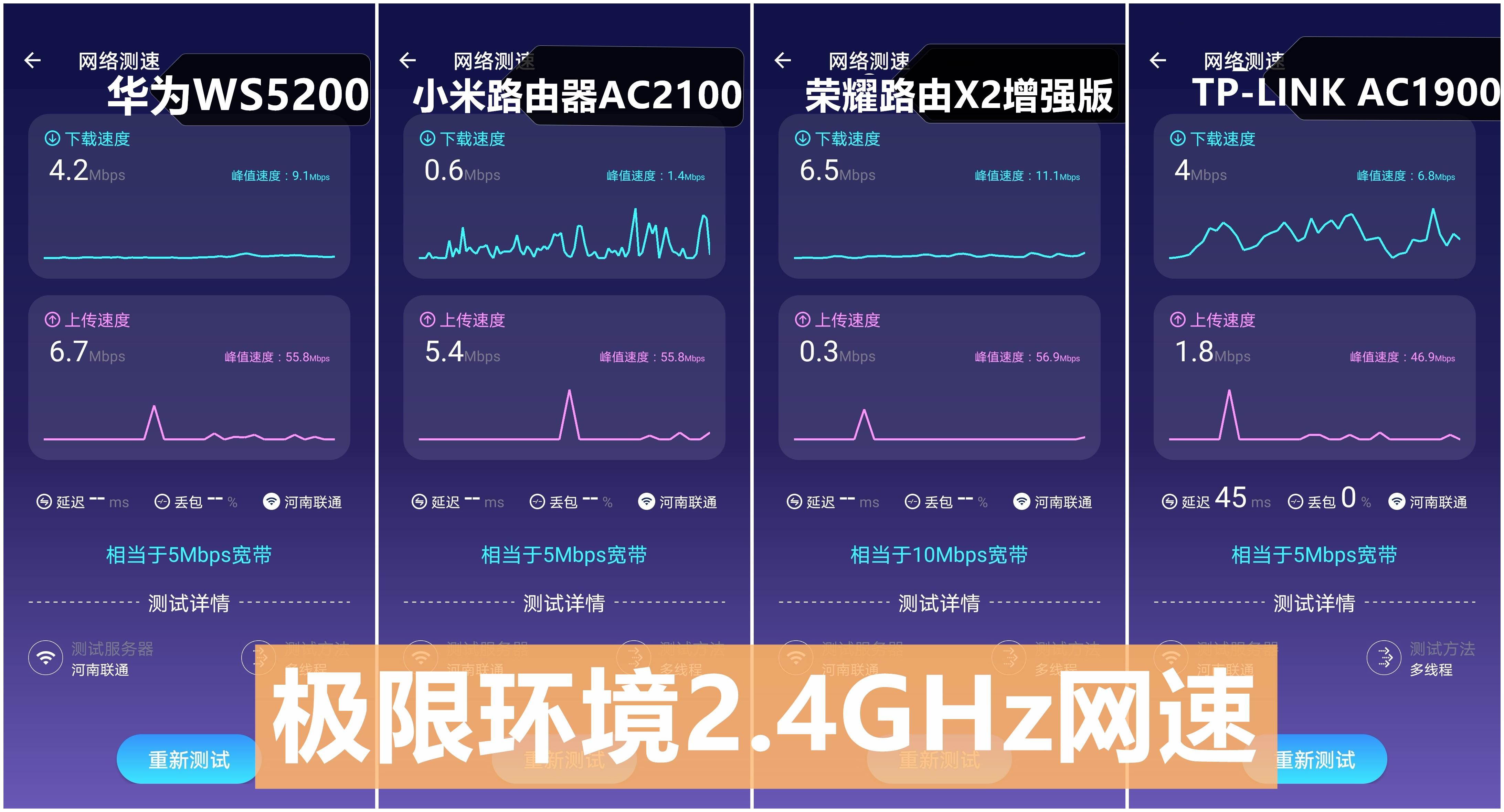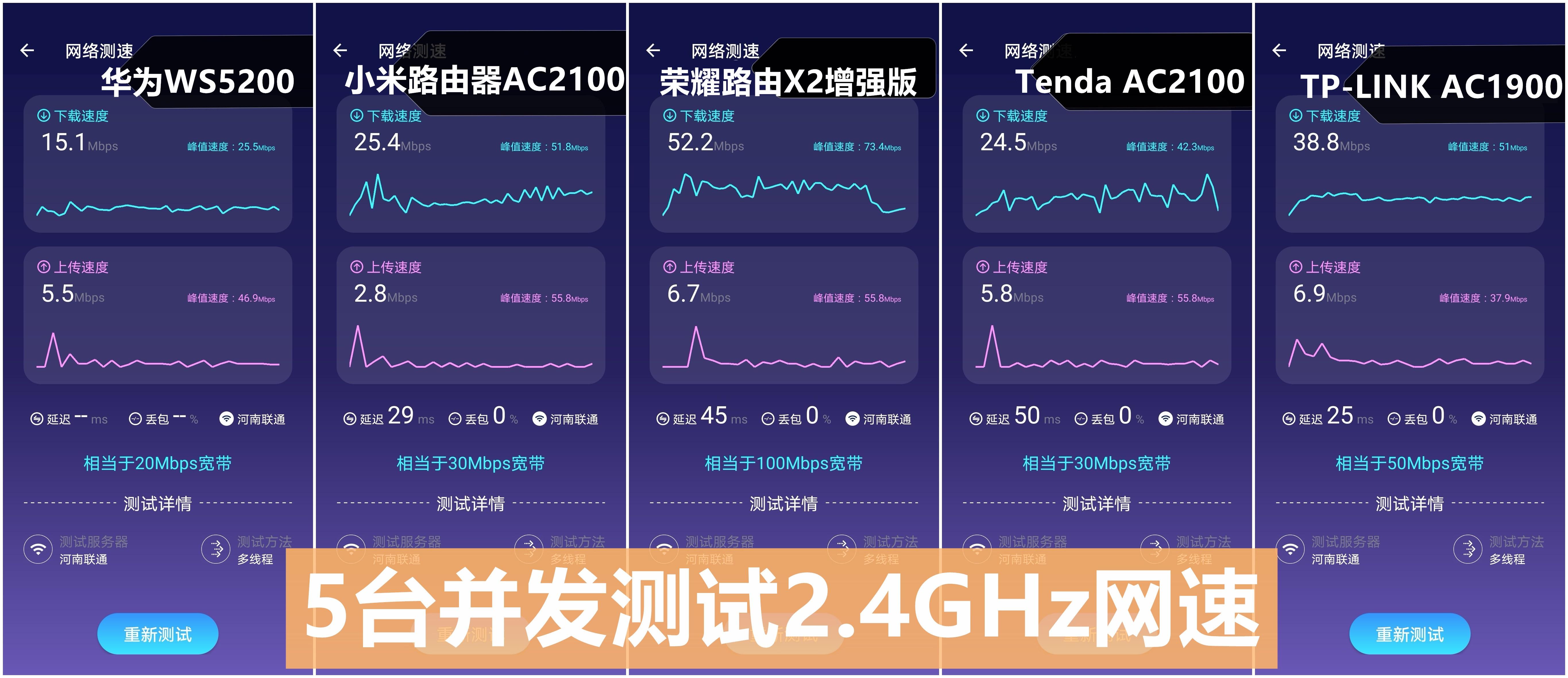 需要提前说一下,这五款路由器均支持2.4GHz+5GHz双频并发,但会影响到极限环境的测速,所以分别来测试2.4GHz和5GHz的速率。