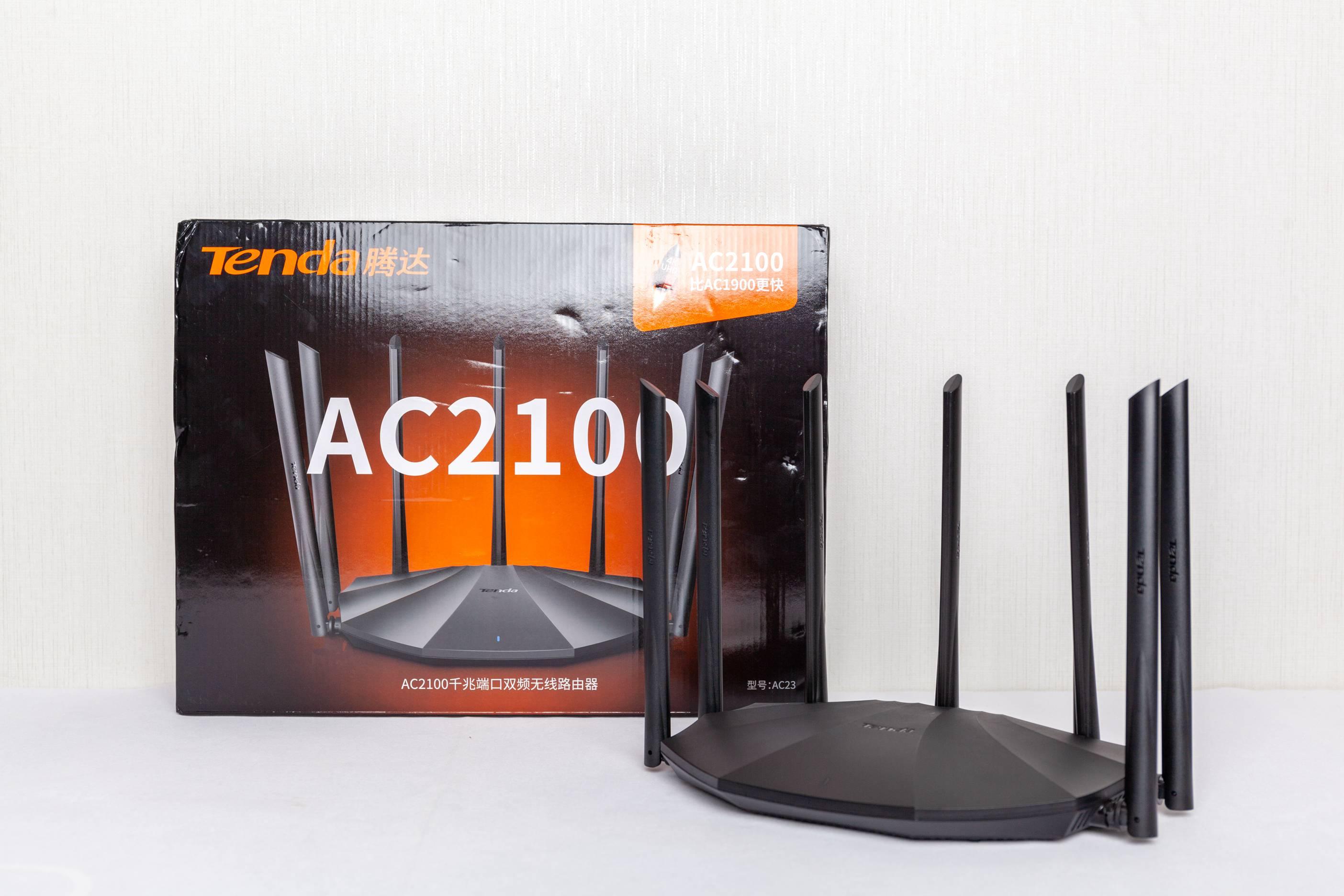 Tenda AC2100是五款路由器中天线数量多的一款,外置有7根dBi天线,但实际上,路由器的信号强弱和天线数量没有太大关系,主要还要看功放芯片如何。Tenda AC2100机身提供4个千兆接口,外形属于常见的路由器款式。