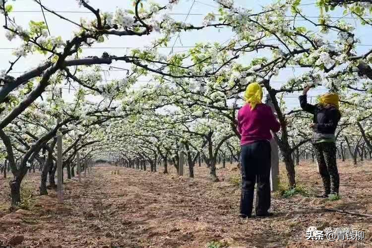 盛花初期,喷施 0.3%磷酸二氢钾+0.3%硼(酸)砂促进坐果;以人工授粉为主(图 2);有条件的果园每亩放一箱蜜蜂或 50~100 头角额壁蜂进行授粉。