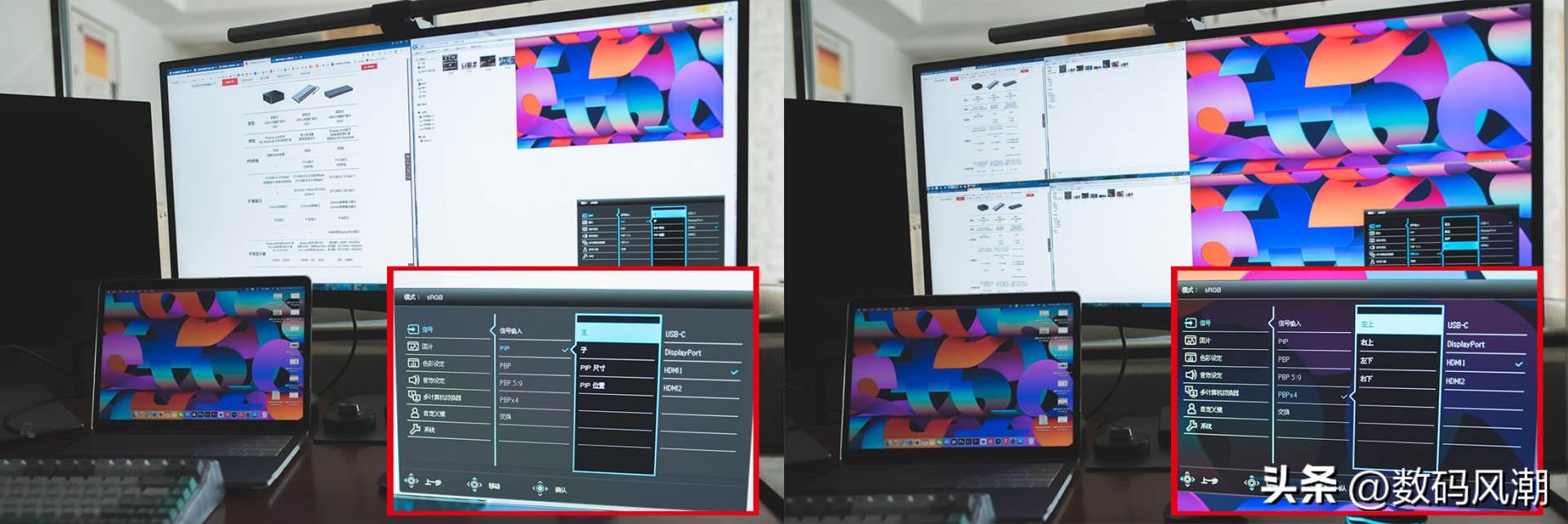 前面提到带鱼屏就是为了平时用单屏就行了,这时PIP\PBP功能就凸显出作用了。PD3420Q将后置四路显示输入完全利用,PIP(画中画)可对子显示进行尺寸、位置、切换的快速设定。