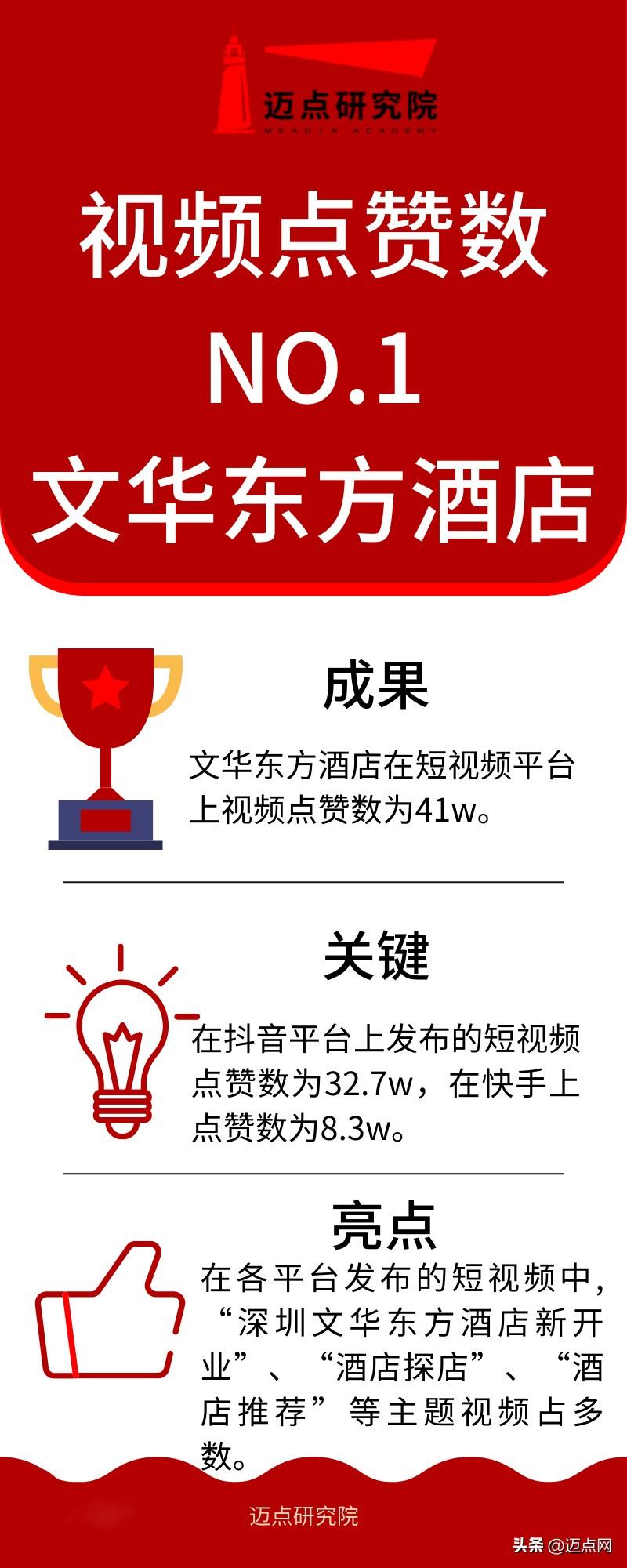 本月,百强榜单中各酒店短视频点赞数均值为2.8w,其中来自抖音渠道的短视频点赞数多,有关文华东方酒店短视频点赞数多,一共有41w点赞数,其中抖音点赞数有32.7w条,快手视频点赞数有8.3w条,文华东方酒店是文华东方酒店集团旗下国际高端酒店品牌,文华东方酒店本月在短视频影响力中排名第14位。文华东方酒店短视频数量不多,一共190条,但是点赞数量远超其他酒店集团,说明其短视频质量较好,深受观者喜爱,观其短视频内容多为“深圳新开业文华东方酒店”、“酒店推荐”、“探店文华东方酒店”等,有关,抖音有关“文华东方酒店”的话题累计1663.4w次的播放。