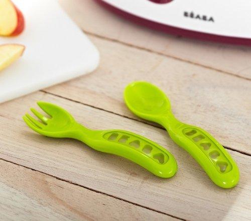 Beaba家的宝宝餐具,除了有常规的硅胶软头勺、带存储盒的训练勺叉外,还有一款360旋转训练勺。这款训练勺由法国设计师Frederic Bugnot设计,把手的旋转设计,可以让勺子部分永远保持平衡,,既让宝宝练习抓握自己进食,又宝宝能吃到自己勺子里的东西,增强宝宝自我进食的自信心。