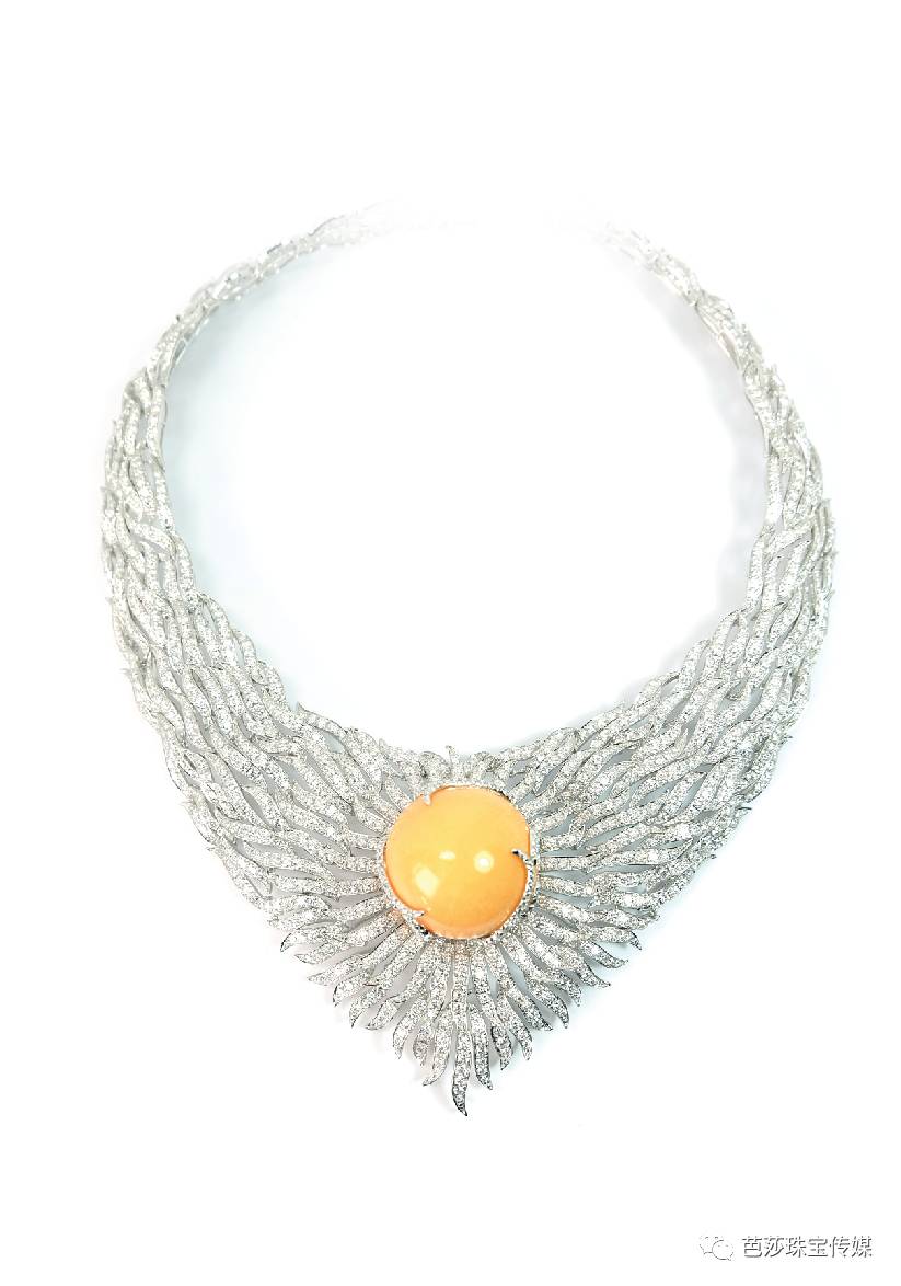 任何一个珠宝Fan看到这款项链应该都会心跳加速吧!芭珠姐对它简直有一见钟情的感觉,要知道,如此大颗的美乐珠恐怕是比白马王子还难找到。美乐珠属于海螺珠的一种,属于极其稀有珍贵的珍珠,它特殊的色彩让人过目难忘。设计师将美乐珠灵动地包裹在茫茫钻石之中,虽然项链采用了大量的钻石增强整件珠宝的华美程度,但完全不会夺掉主角美乐珠的风采。