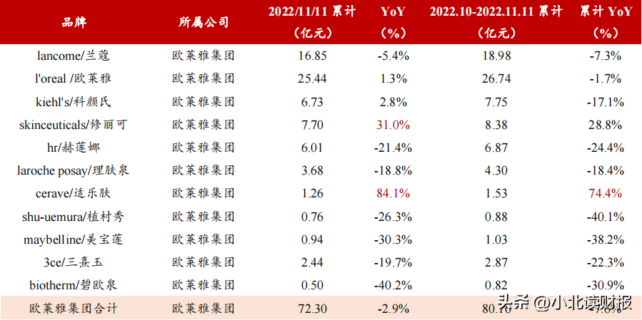 以外资护肤品牌第一名欧莱雅为例,2022年双十一,欧莱雅集团合计实现销售收入72.3亿元,其中欧莱雅、兰蔻两大单品一天收入规模便分别达到了16.85亿元、25.44亿元,但均增长一般。