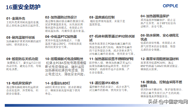 与此同时,欧普也在安全方面加大了创新保障,据悉,欧普智擎系列浴霸BP30则是提供了16重安全防护,包括主机外壳采用耐高温的金属; 防止因机身过热而引起异常;加热器防过热、限温保护;机体与面罩通过IPX2防水测试;全密封LED灯等。