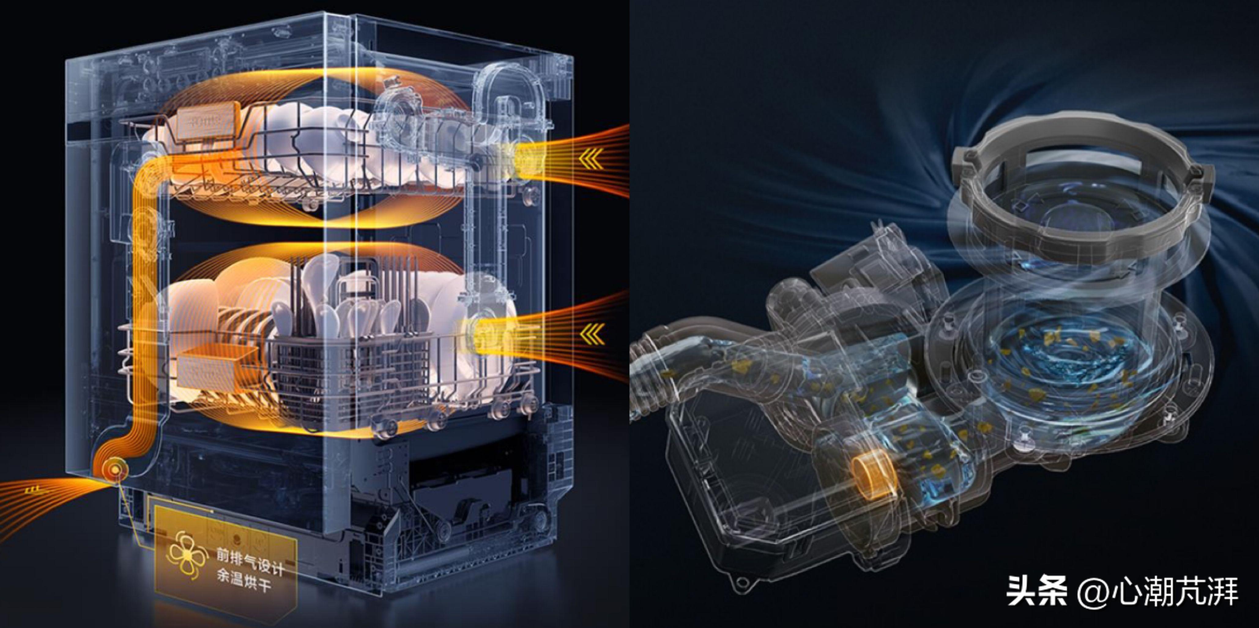 冷凝/余温烘干冷凝烘干也叫余温烘干,主要是通过冷热交换来使洗碗机内腔内的湿气遇冷凝结为水,终滴落并排出。