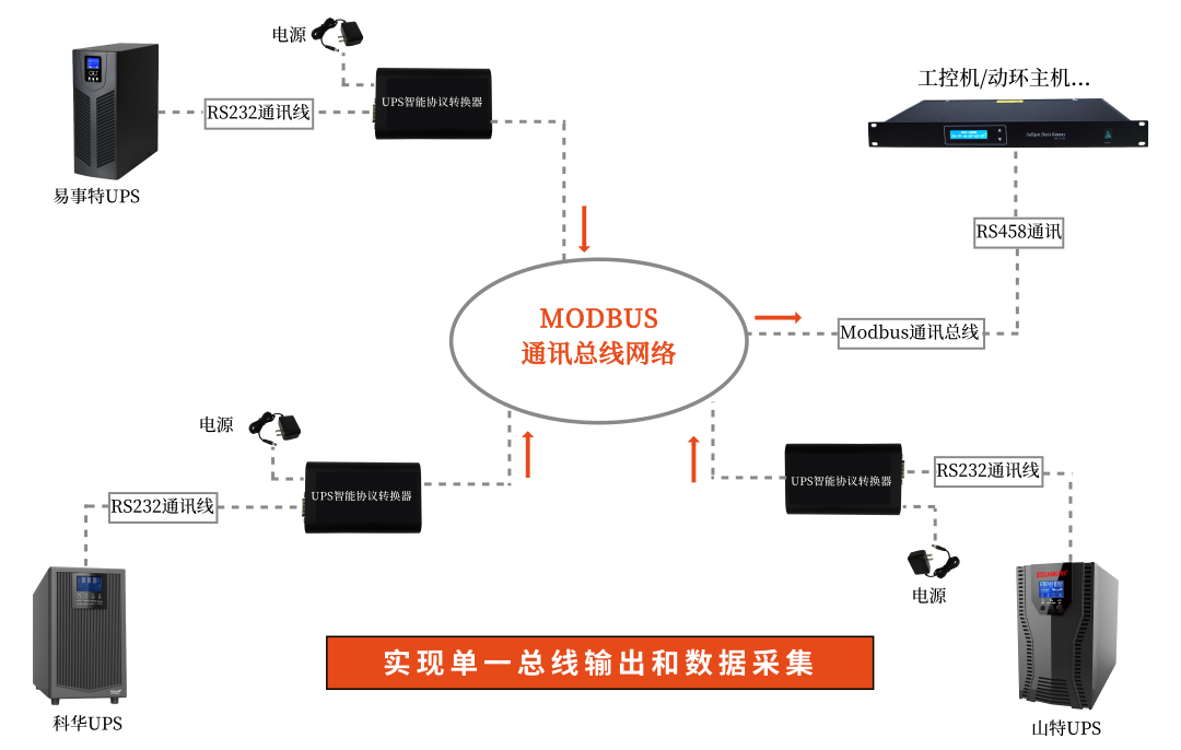 前端通过UPS电源连接UPS智能协议转换器,即可将不同品牌的UPS电源各自的通讯协议转换成机房监控中普遍所使用的标准的MODBUS协议。同时UPS智能协议转换器具备RS485通讯接口,使用户能轻松接入到上位机/动环主机,从而实现单一总线、不同品牌、协议的UPS在线集中监控。满足用户在线通过各类动环监控系统实时查看每一台UPS电源的实时运行状态的要求。