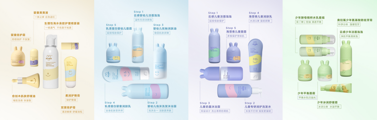 作为国内首个打出儿童分龄洗护理念的品牌,兔头妈妈入局国内儿童洗护赛道不到2年,年销售便突破5亿。从不同年龄儿童肌肤问题出发,衍生出的分龄研究,兔头妈妈打造出四阶儿童肌肤护理方案:s+问题肌、0-3岁新生肌、3-12岁学龄肌、13+岁少年肌。