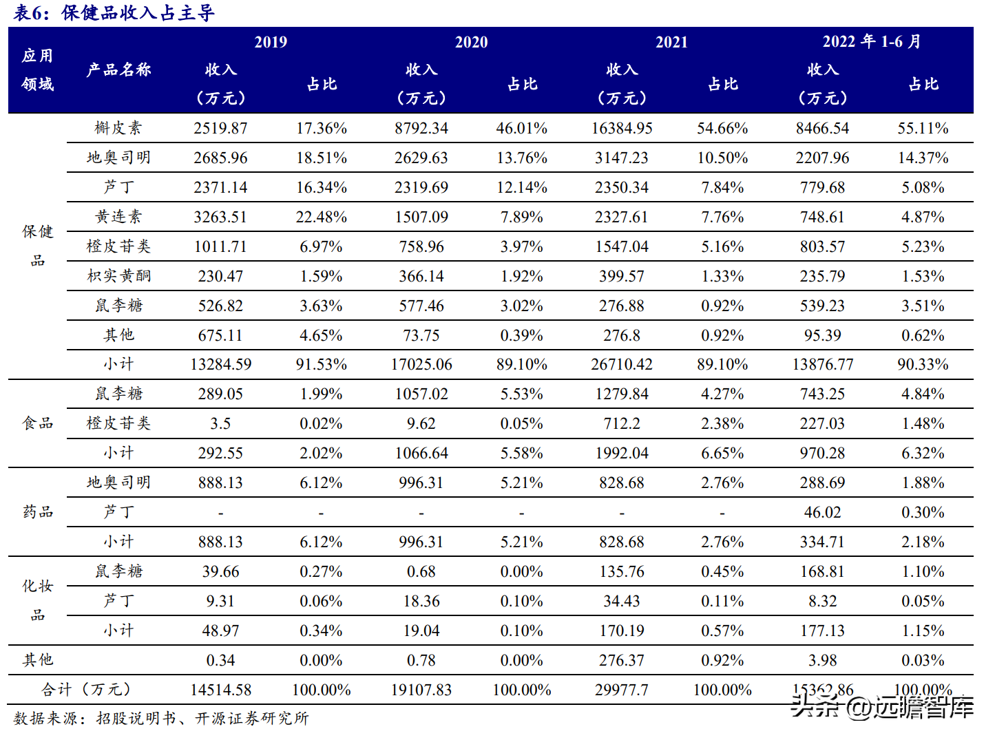 从主营业务收入构成的变动趋势来看,槐米提取物的收入占比总体呈上升趋势,由 2019 年的 39.66%上升至 2021 年的 68.27%。枳实提取物销售收入占比由 33.21% 下降至 22.14%。