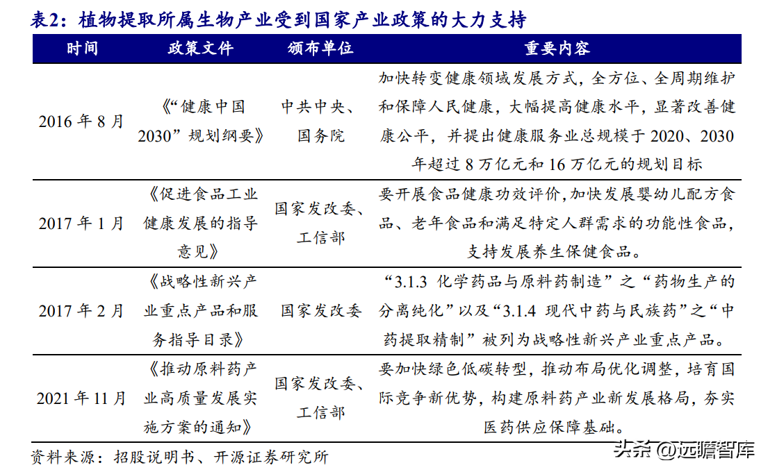 植物提取所属生物产业是我国七大战略性新兴产业之一,受到国家产业政策的大力支持。植物提取物主要应用的大健康产业在我国具有优先发展的战略地位。绿色、健康的天然功能成分健康产品得到了国家产业政策的大力支持,为健康、绿色的植物提取行业奠定了良好的发展基础。