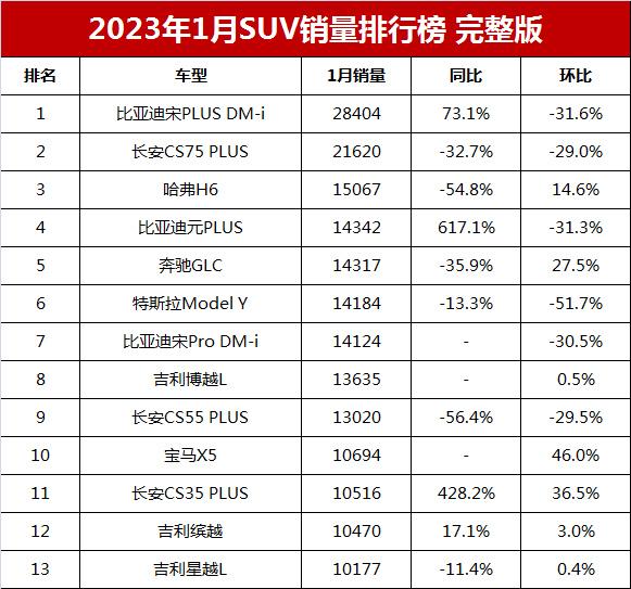 1月份,比亚迪宋PLUS DM-i以28404辆的销量蝉联SUV销量冠军,同比增长73.1%,环比12月则下降31.6%。