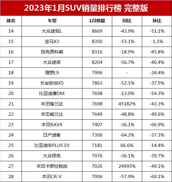 【2023年1月SUV销量排行榜完整版】日前,乘联会官方公布了2023年1月国内SUV市场销量数据。数据显示,受春节长假等因素的影响,国内SUV市场销量大幅下跌,全国SUV零售销量只有62.3万辆,同比下降36.2%,环比12月下降39.0%。其中,1月份销量过万辆的SUV只有13款车型,比上月大幅减少17款车型。下面,我们一起来看看今年1月297款SUV细分车型的零售销量及其排名情况:
