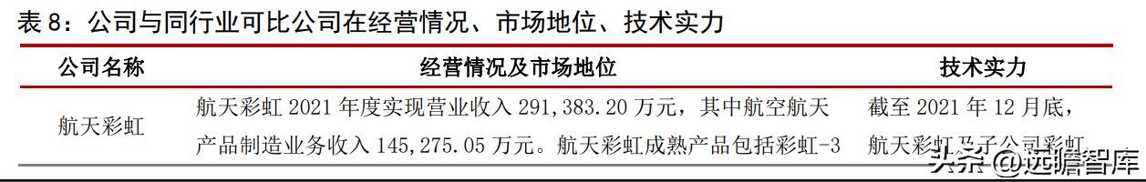 国内具备侦察打击一体化无人机生产销售的上市公司较少,同时中无人机研制、生产的无人机系统主要应用于军用领域;航天彩虹主要从事无人机业务和膜业务,无人机产品主要用于军事用途,与中无人机可比性较强,选取其作为上市可比公司。