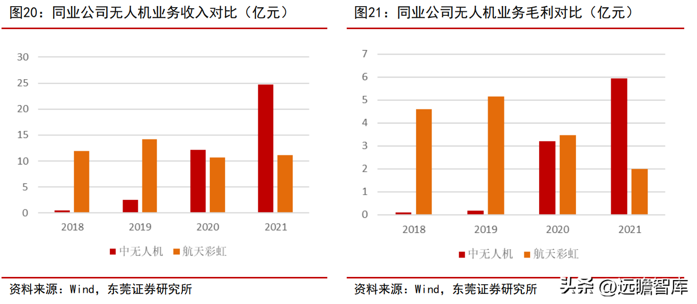 中无人机于2019年开始建立了独立的采购及销售体系,并开始独立面向市场对外销售翼龙无人机系统,导致公司营业收入快速增长,无人机业务收入由2019的 2.51 亿元增长至2021年的 24.76 亿元,无人机业务收入在2020年后超过航天彩虹,并处于国内领先地位;毛利方面,中无人机的无人机业务毛利从2019年的 0.18 亿元上升至2021年的 5.94 亿元,在2021 年超过航天彩虹。