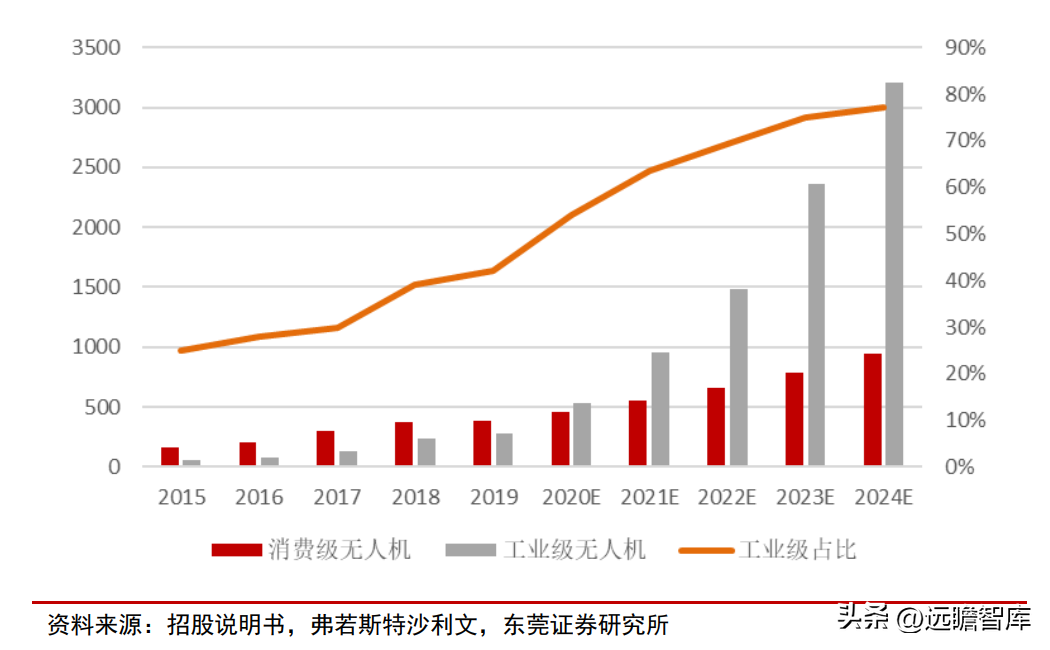 根据 Frost & Sullivan 预测,2024年中国民用无人机市场规模将达到 2,075.59 亿元,随着应用场景的不断拓展,工业无人机实现快速发展;预计中国工业无人机市场规模将超过消费级无人机,成为民用无人机细分领域的主要市场。