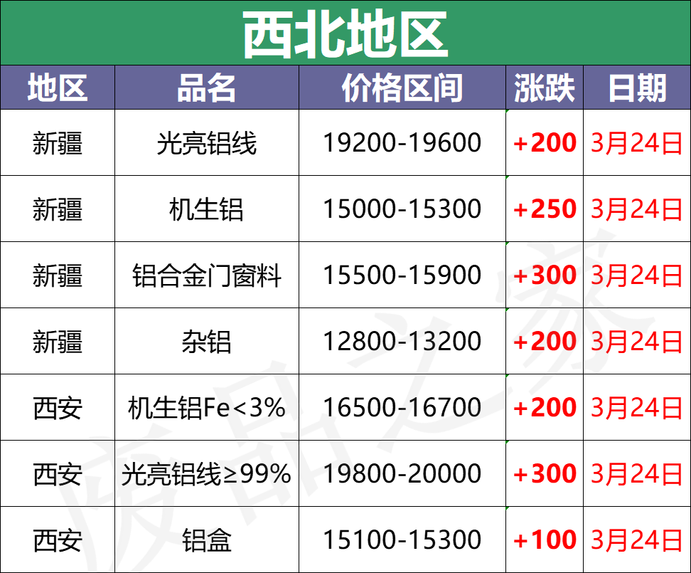 3月24日起,上海沪闽再生资源废铝收货价:亮铝线19800,灰线19500,6米白料19300,6063新白料19100,6米油漆料18400,油漆料17900,断桥16200。