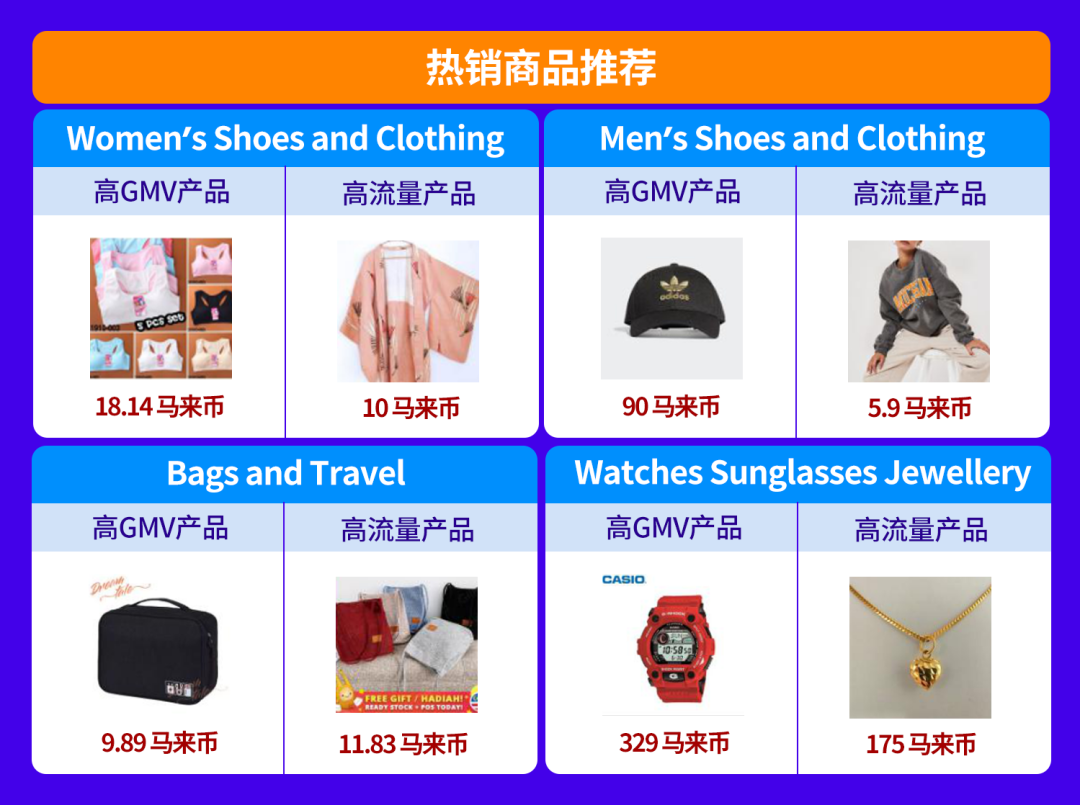 在热需产品中,无肩带(性感)内衣、紧身运动服大受女性欢迎,而男性则喜欢在Lazada平台上购买运动鞋,无论是高GMV产品或是高流量产品都有运动鞋的身影。