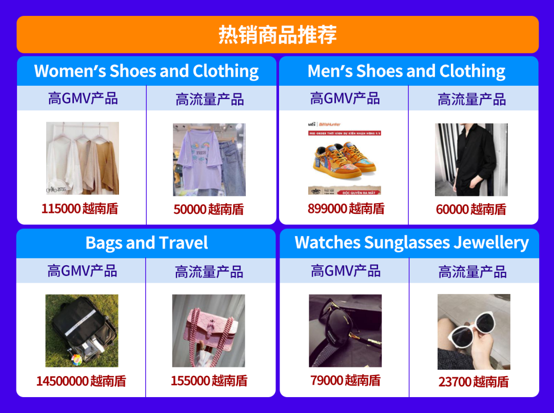 在鞋服中,防晒针织衫、一直流行的淡紫色T恤与阔腿长裤,2020年的时尚穿搭越南美眉都悉数掌握了,还有男士手绘运动鞋、黑色衬衫,以及同色系的情侣T恤都是近期越南热销的产品。