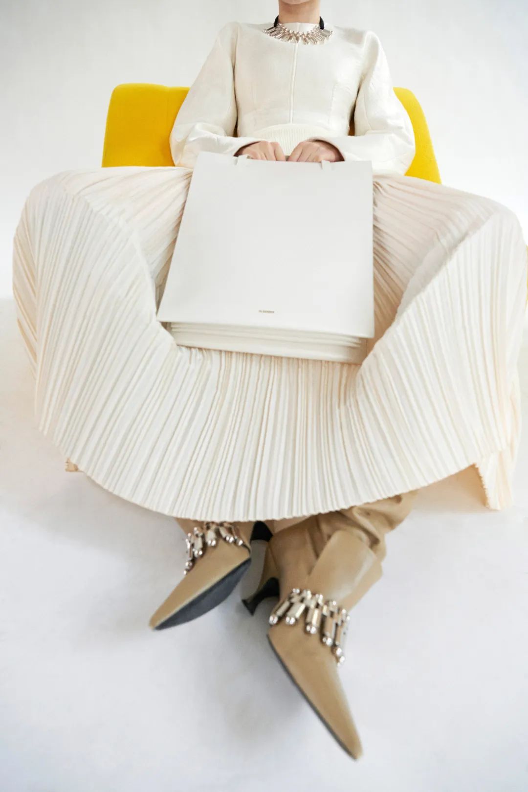 这条白色的Bottega Veneta白色无袖连衣裙也被「豆总」穿出了独特的韵味。深色的小毛衫被当作腰带束出腰线,开衩长裙露出纤细的腿部线条,一双小高跟人字拖穿出了随性的态度,悄悄地又长高了几分。